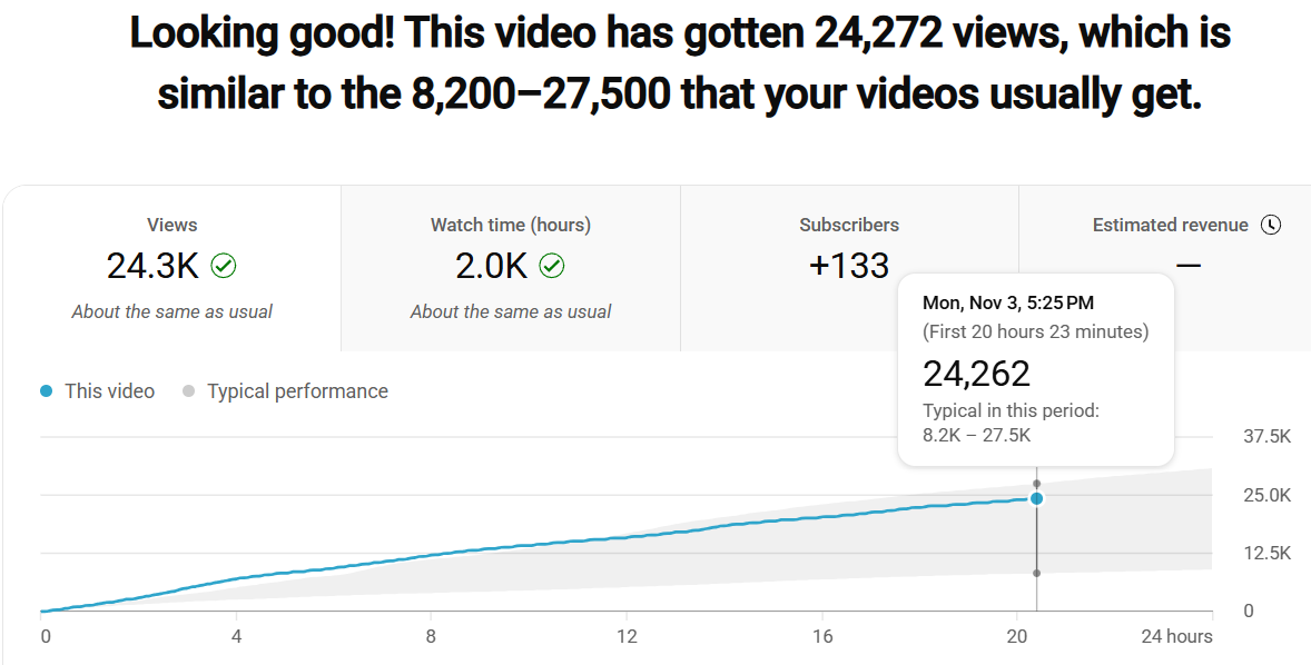 So much for that! We thought the next video on this front—about the UK housing bubble—would have to out-rate this Australian-focused video, simply since the UK has twice as many people as Australia. But comparatively, it bombed. The grey band in the next plot is the same scale as the one in the previous video. It had 24,000 views in its first day, compared to 44,000 for the Australian video. The UK video’s views remained in the grey band, whereas the previous Australian one—which we thought would have less appeal—towers over the grey band.