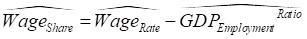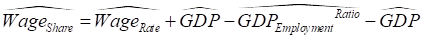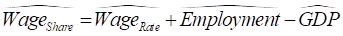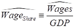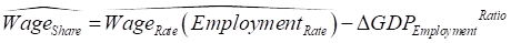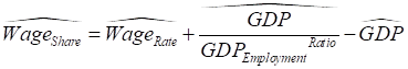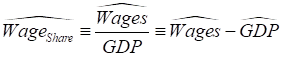 This also means that the percentage rate of change of the wages share of GDP is equal to the percentage rate of change of that ratio. Using a “hat” (Ù) symbol to indicate the percentage rate of change of a variable, we get