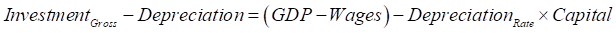 Measured depreciation of physical capital is a fraction of existing capital, and the rate of depreciation is normally measured at about 6% p.a. That leaves gross investment to consider, and the simplifying assumption that Goodwin made was the best possible one for a capitalist system: he assumed that capitalists invest all their profits. Since profits in this simple model are equal to output minus wages, we can write: