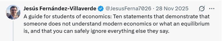 Here’s the “Howard Marks Presidential Professor of Economics at the University of Pennsylvania”, Jesus Fernandez-Villaverde, asserting that anyone who doesn’t know what an equilibrium is—as defined by Neoclassical economics—should be ignored: