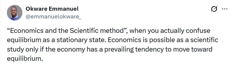 At the other end of the economics pecking order, a recent graduate economist opined that “Economics is possible as a scientific study only if the economy has a prevailing tendency to move toward equilibrium”