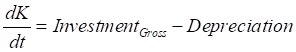 The rate of change of capital is net investment, which equals gross investment minus depreciation: