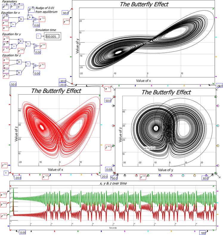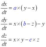 These economists, who think they’re doing advanced modelling, are in fact stuck in an intellectual cul-de-sac which is primitive from the point of view of modern mathematics. About sixty years ago, scientists and mathematicians discovered “complex systems”: extremely simple models could generate behaviour which could not be generated using equilibrium methods. The first was Lorenz’s model of fluid dynamics (Lorenz 1963). It was a deliberately simple model with just three variables and three parameters. Avert your eyes if equations aren’t your thing, but this is just about the simplest system you can imagine. There are just 3 variables (x, y, and z) and three constants (a, b and c), so it’s hard to imagine that this model could generate anything interesting: