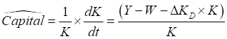 Using Y for GDP, W for total wages, and DKD for the rate of deprecation, the expression for the rate of change of the Capital stock can be written:
